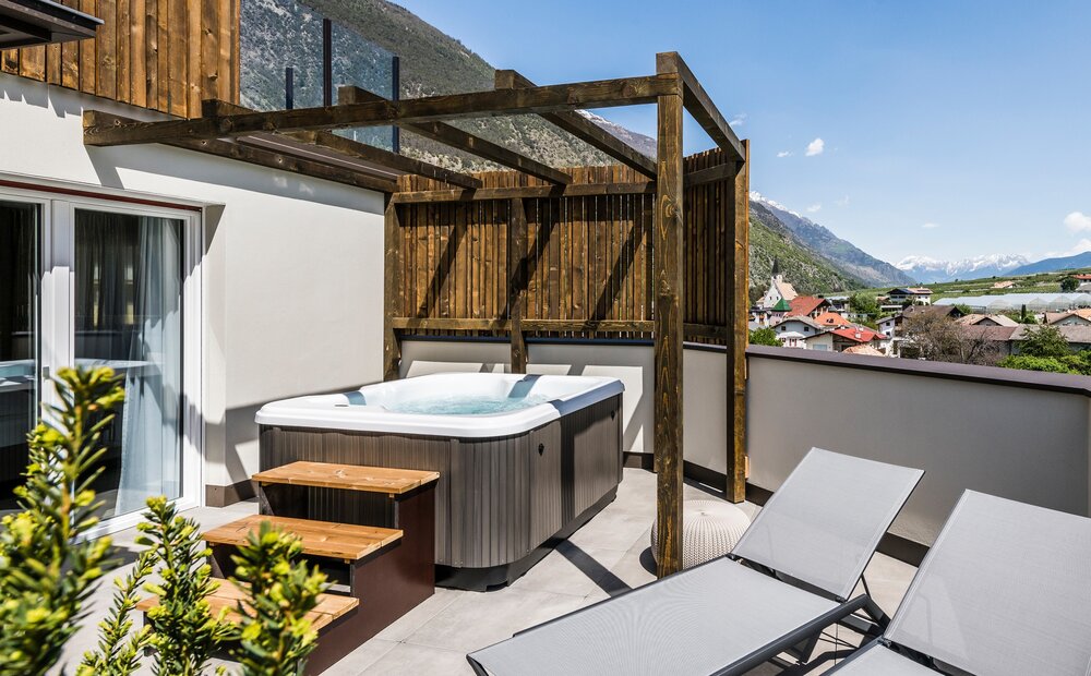 - South-facing terrace with midday and afternoon sun with whirlpool, loungers, quiet, view of the mountains and apple orchards