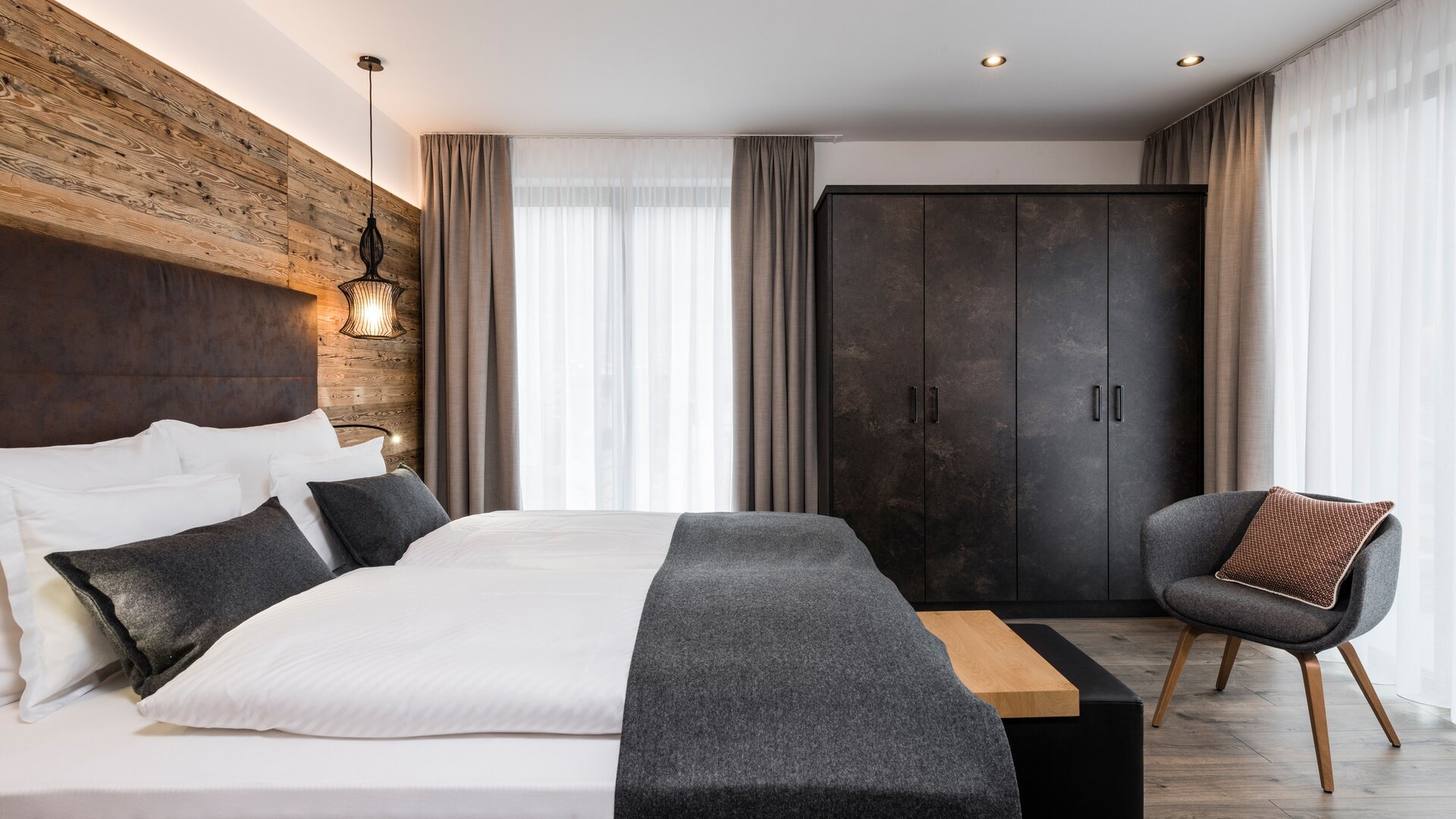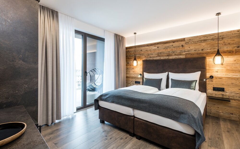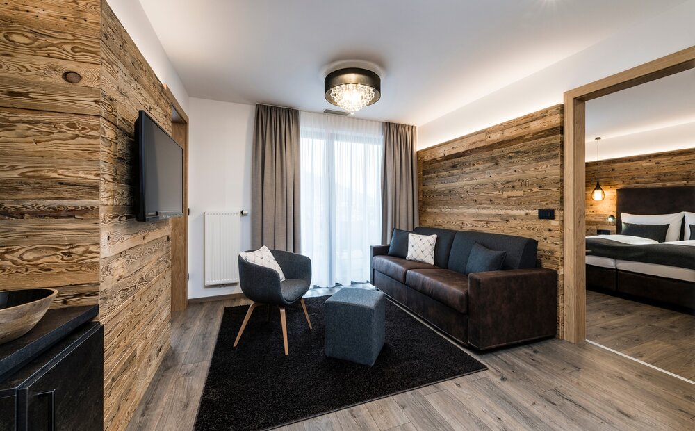 The family penthouse suite opens up views of the expanse of the Vinschgau Valley. Spacious rooms, 300-year-old wood and a fantastic panoramic view create space for spending time together. A separate bedroom provides a retreat and privacy – stylish living, full of cosiness and views.