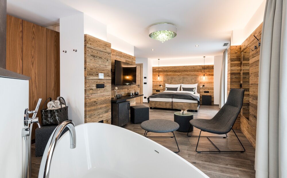 This suite combines alpine cosiness with a private wellness feeling. The free-standing bathtub and private Finnish sauna provide cosy warmth and peaceful moments. Fine materials, spacious rooms and soft light create an atmosphere to arrive, let go and enjoy in the Vinschgau Valley.