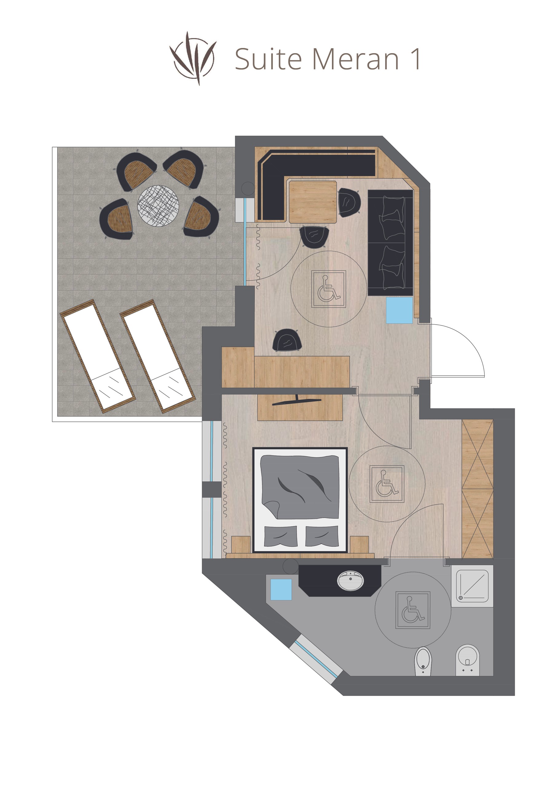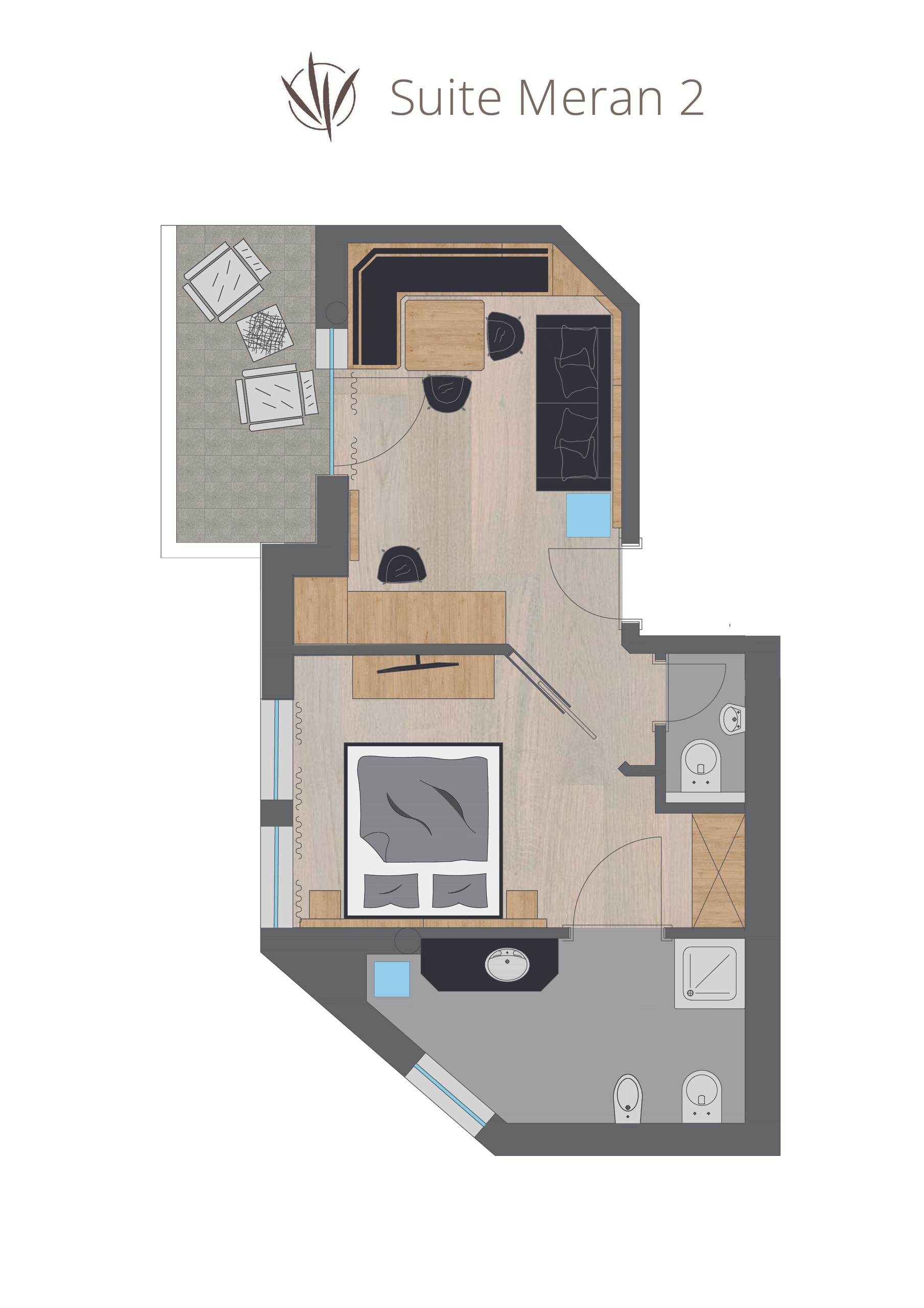 Suite Meran combines quiet living with character. Elegant wood panelling and harmonious colours create a cosy atmosphere in this fine, compact suite. A light-flooded relaxation room for conscious time-outs in the sunny Vinschgau Valley – ideal for arriving, taking a deep breath and savouring.